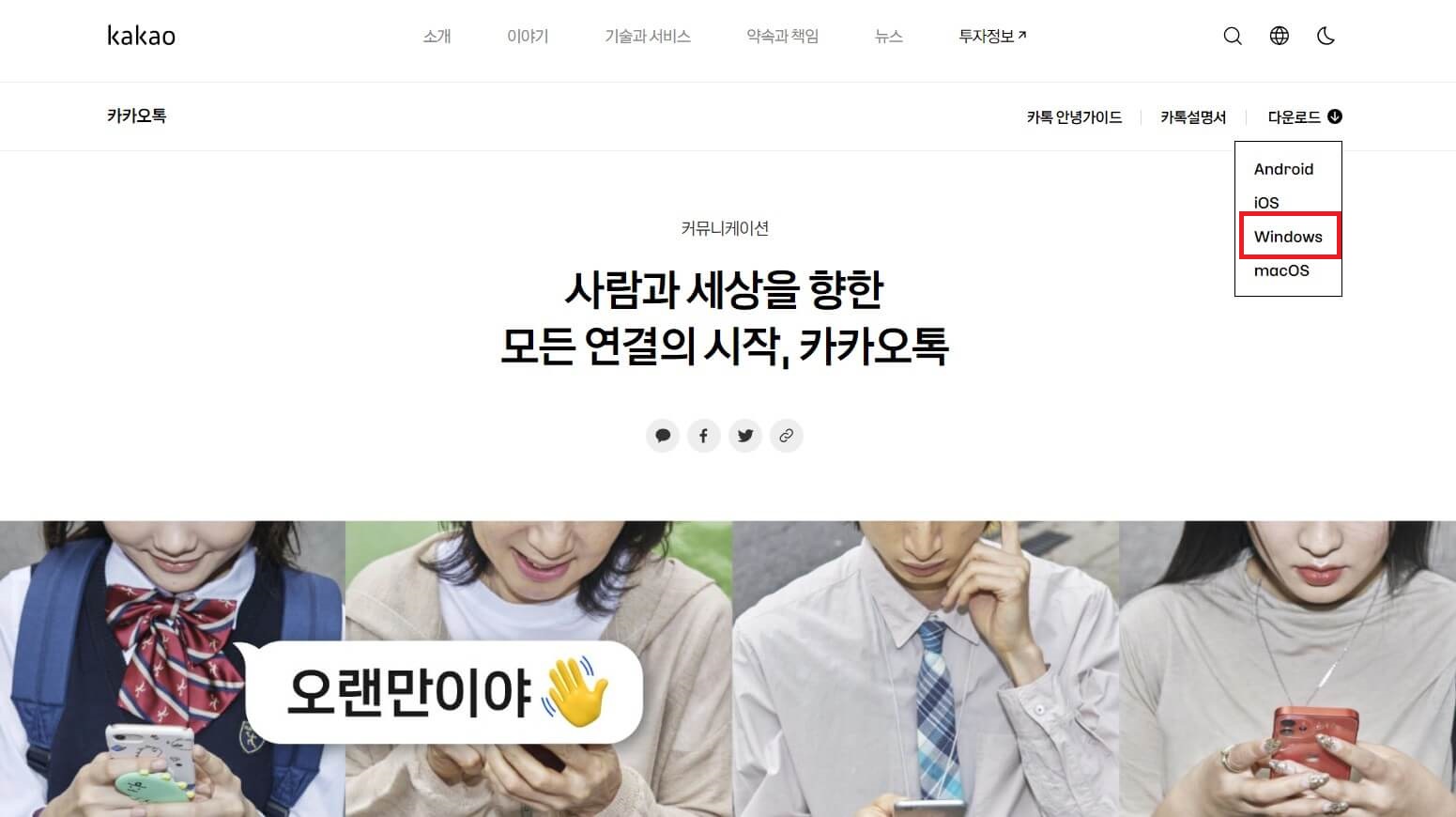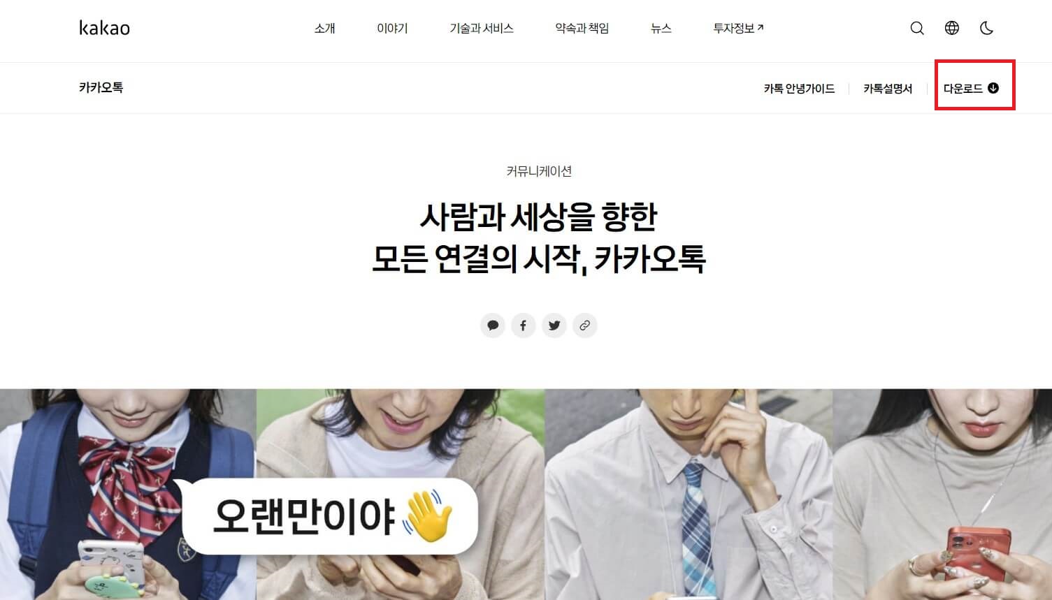 1) 위의 링크를 클릭해서 카카오톡 홈페이지에 들어갑니다. 오른쪽 위에 다운로드를 클릭합니다.