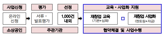 온라인신청 -> 서류발표평가 -> 1000건 내외선정 -> 재창업 교육 및 재창업 사업화 (교육지원 & 협약체결 및 사업수행)